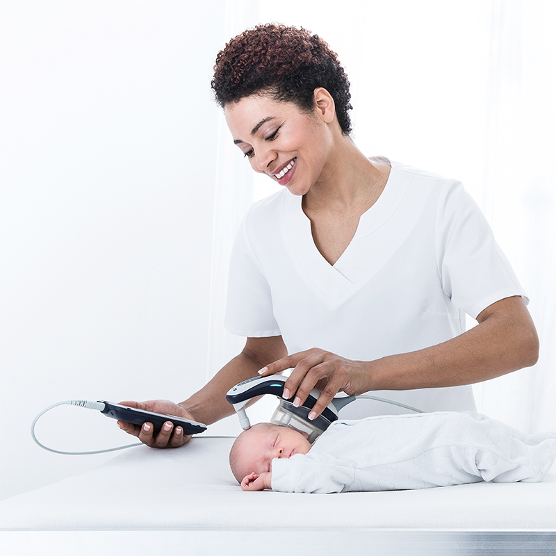 Titan(タイタン)- 自動ABR:ハンディータイプの自動ABRによる新生児聴覚検査装置です。自動ABRのほかにOAEやインピーダンス検査モジュールを搭載可能です。刺激音はCE-Chirp®をお使いいただけます。