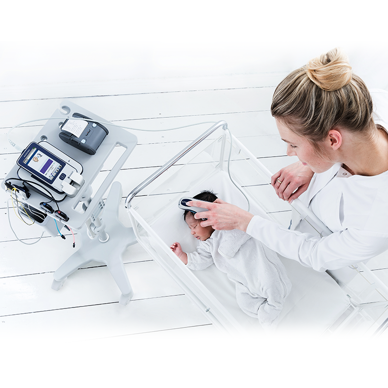 自動ABRによる新生児聴覚スクリーニング検査装置です。電極とヘッドホン一体型の「ベラフォン(BERAphone®)」を使用すると、使い捨て電極が不要のため、電極の粘着部分の付け外しによる痛みを赤ちゃんに与えることなく、赤ちゃんにも環境にも優しい検査が可能で、検査にかかる消耗品コストを大幅に削減できます。また、オプションでOAE検査(DPOAE/TEOAE)を追加できます。